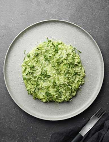 Boil 200g peas, 100g zucchini cut into 1cm pieces and 100g asparagus stems cut into pieces for 2-3 minutes until tender. Strain and blitz in a blender with 100g room-temperature mascarpone until vibrant green and smooth. Make the risotto as described but omit the parmesan. Fold through the vegetable purée and crumble or grate over 80g feta. Garnish with coriander or microgreens and serve immediately.