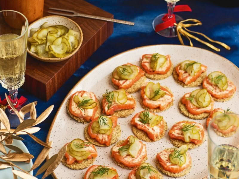 Oat cakes with salmon terrine & gin-pickled cucumbers