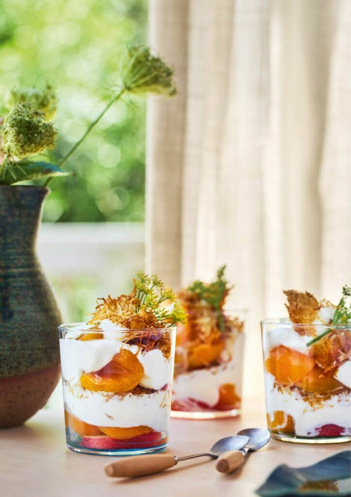 This is inspired by Eton Mess, but uses crisp kataifi pastry for crunch to replace the meringue. I have poached the apricots in a fennel seed syrup, but you could flavour the syrup with vanilla, cinnamon, citrus or orange-flower water.