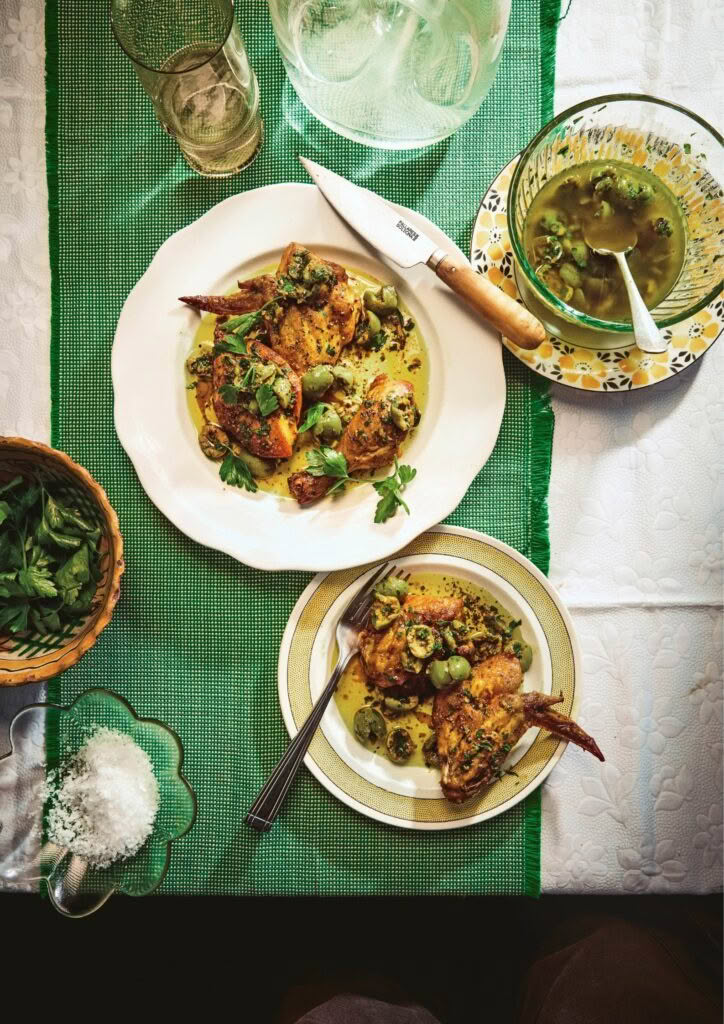 This chicken has far too few ingredients to be as complexly flavoured as it is, but that is the magic of vinegar, crushed briny olives, fresh garlic and lots of chicken fat. Given how simple this whole thing is (classic ‘roasting tray dinner’), my one plea is to really roast your chicken until it’s deeply browned – the success of this recipe depends on it. I know that may seem obvious, but different ovens function differently, so I want you to ask yourself before removing the chicken: ‘Could this chicken be browner?’ If you hedge even a little, the answer might be yes. Keep roasting. Colour equals flavour, which is why this (maybe very scary) recipe asks you to turn your oven to 230°C, pushing at least one person reading this beyond their comfort zone. But the result when cooking chicken this way is browned skin, juicy meat and fantastically golden, schmaltzy bits left behind, which get deglazed with garlic, crushed olives and a bit of water for dressing your chicken. A true pan sauce, done in a roasting tray, all tangy and stained with turmeric, good enough to drink.