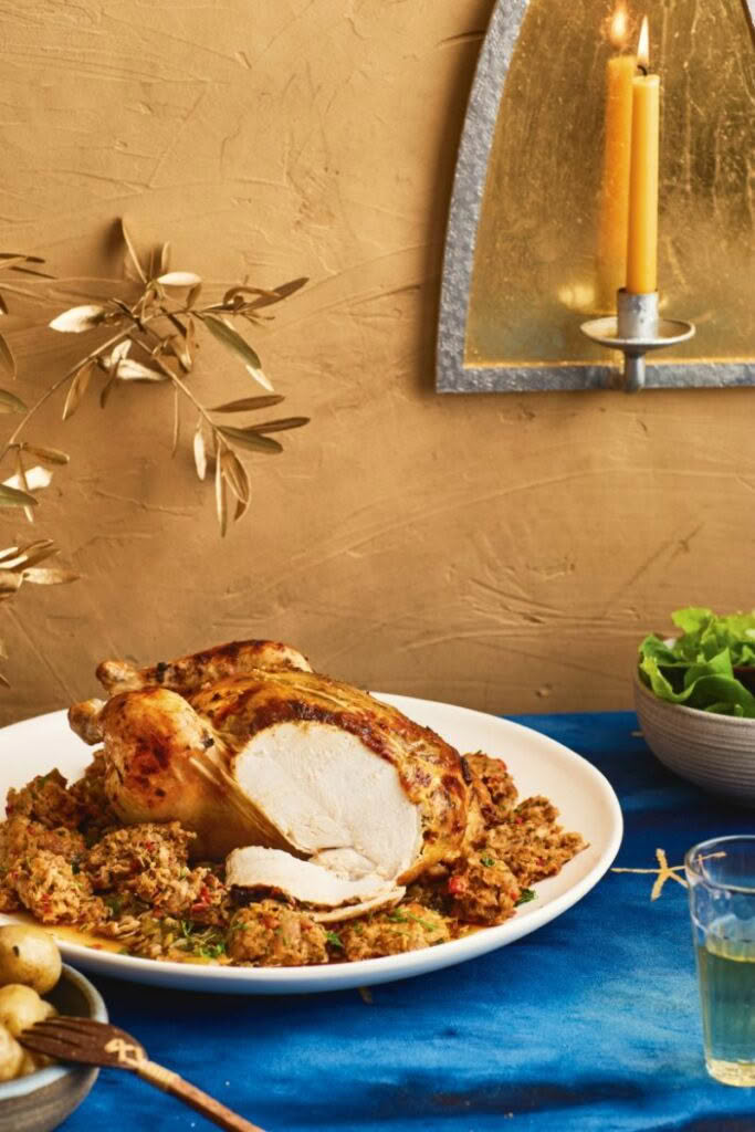 Give me a chicken over turkey anytime; they’re easier to handle, there’s no worries about dry meat and fewer leftovers to deal with. I do like to have a lot of stuffing to serve alongside, so there is plenty of that here and it’s lightly spiced with rose harissa, which does have some heat so adjust to your own preference.