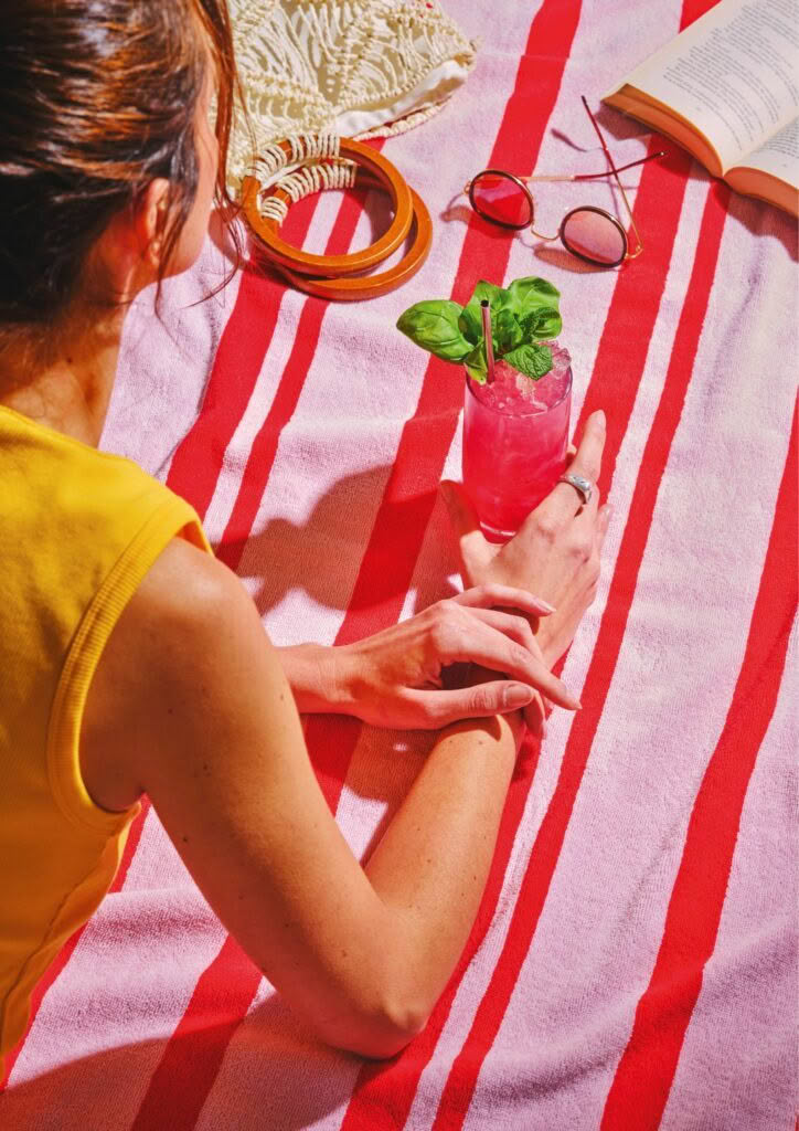 The family of cocktails composed of a spirit, citrus, sweetener and lengthened with soda water lends itself to infinite variations. Leaning into fruity flavours and serving on crushed ice (à la Mojito) means that it fits firmly in the holiday-mode category – also because it is very easy to make and nobody wants to work too hard on vacation!