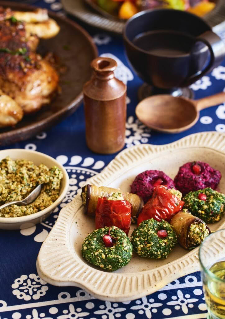 Pkhali are vegetables that are cooked and chopped finely then mixed with walnut paste. The vegetables rolled up with the paste wrapped inside are called badrijani nigvzit.