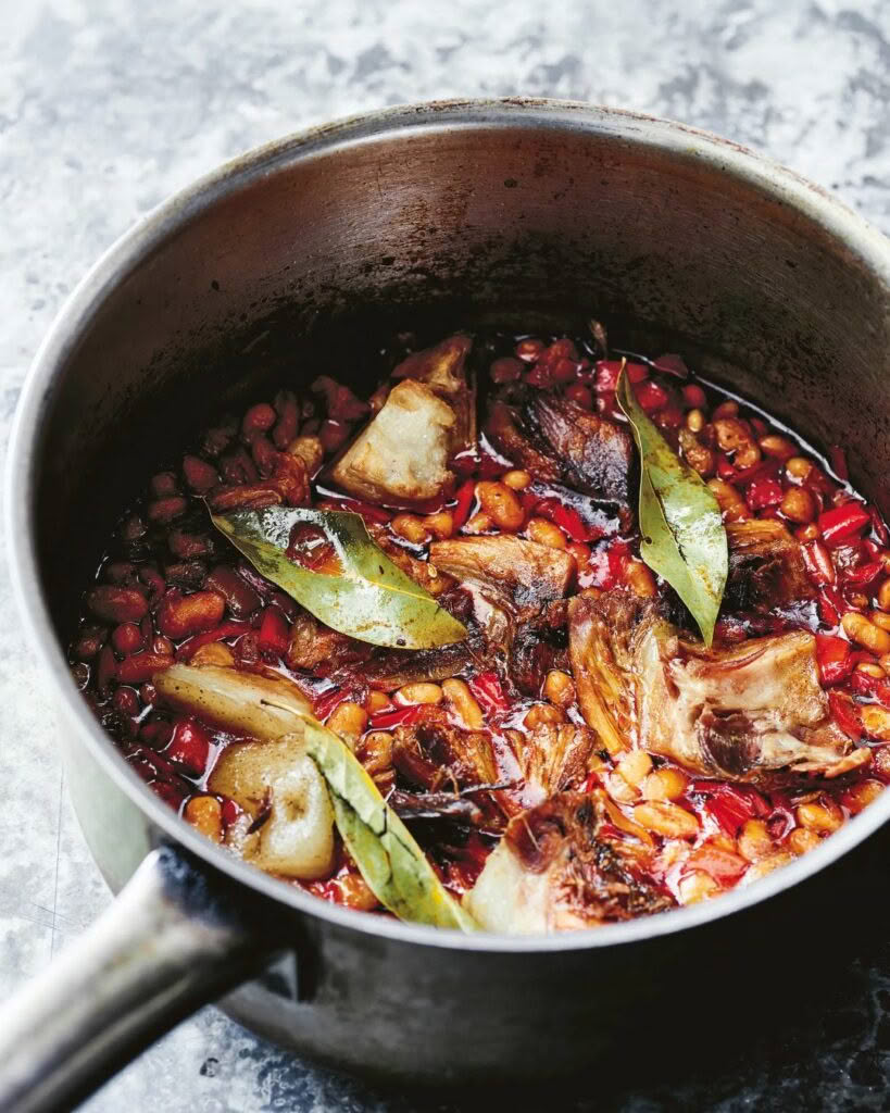 Big joints of slow-cooked meat are something you’d have pretty regularly in Portugal, especially in the winter. We have used haricot beans here, but really you can use any sort of bean that you like. The smoked chilli has come to us over time. We didn’t really see it on the road but discovered it in Melbourne, from a shop called Casa Iberica. A lot of our inspiration has come from walking through markets overseas but, back home, to walk through a deli like that and see so much on every shelf has been really special.