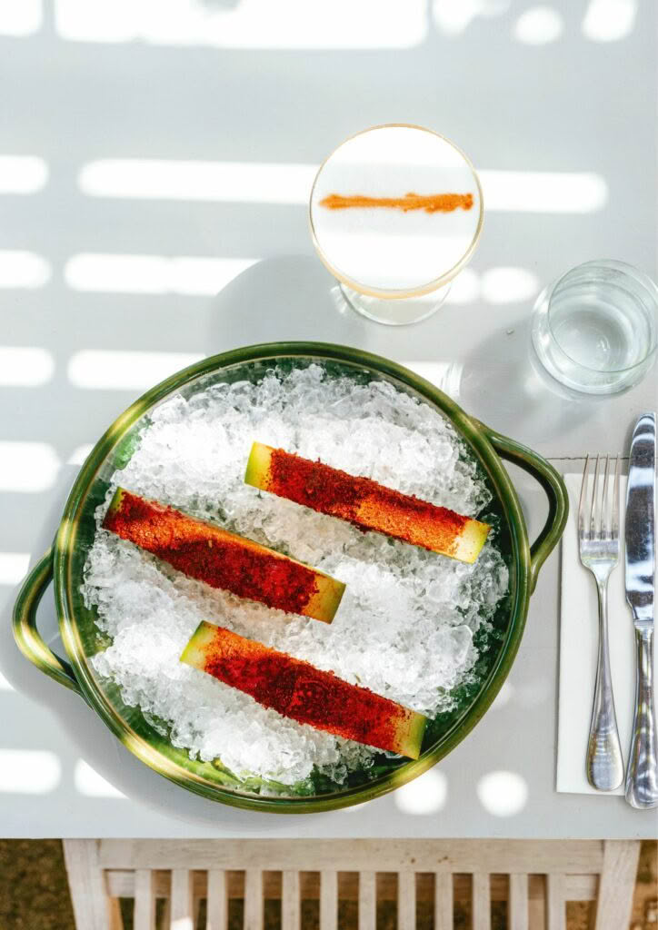 | 4. | To serve, remove the watermelon from the pickling liquid and allow the excess liquid to drain off. Season liberally with the chilli and lime salt and plate the watermelon skin-side down on crushed ice. |