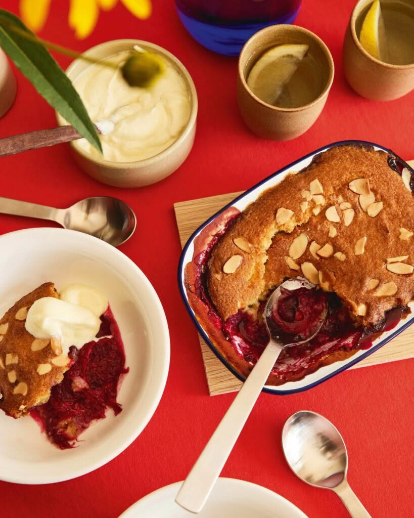 Sponge puddings were a huge part of my childhood and I have to say that the combination of seasonal poached fruit and cake topping is still a favourite thing to eat. Since it is impossible to buy rhubarb in anything more than a bunch I cook the entire amount and use half for this nostalgic sponge pudding while the rest is eaten over the week in breakfast bowls. My lemon verbena plant is thriving and while I mostly drink it as a tea (either the fresh or dried leaves) it is delicious to flavour fruits and is particularly great with rhubarb even though it has a very delicate flavour. You can omit it if you can’t get hold of any.