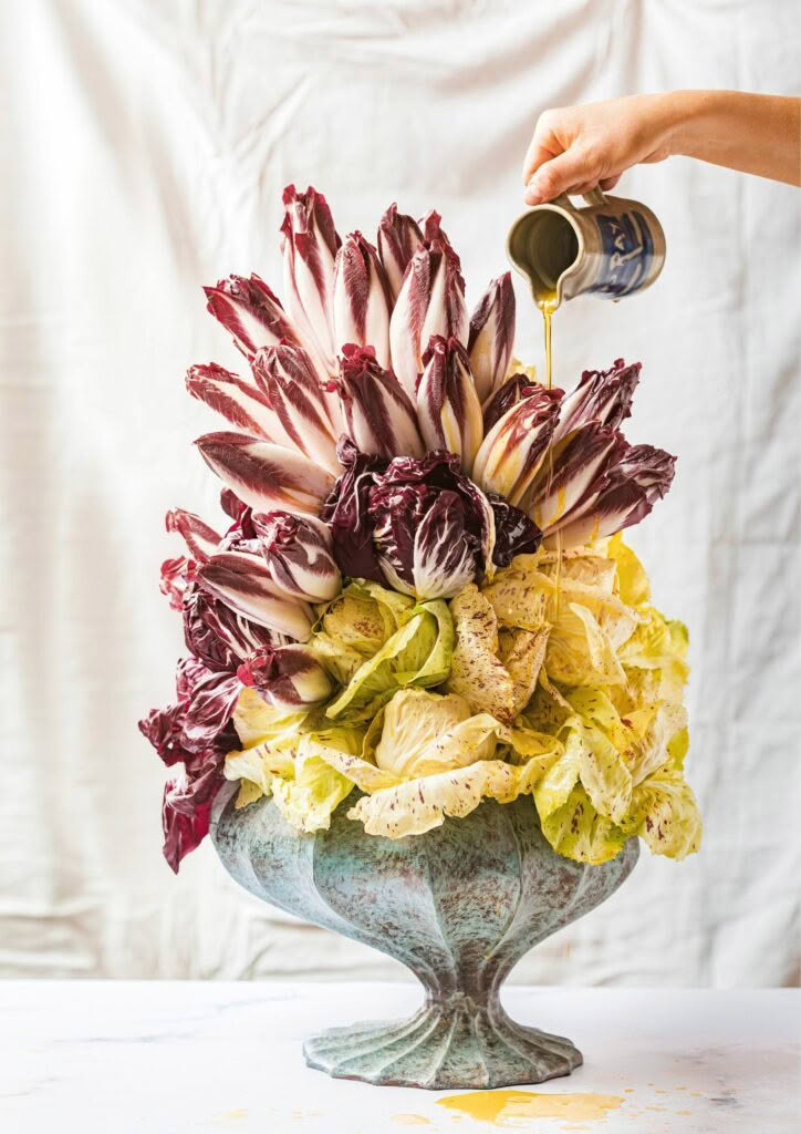 Barbara is my doctor, but she’s also my pal and she adores food. She went to Estela in New York where they have a famous salad made with white endive dotted with anchovies, orange and crisp little breadcrumbs – it’s magnificent. We’ve put our own twist on it using pickled anchovies, Castelfranco radicchio, Tomme au Marc de Raisin cheese, torn pomelo and picada. It’s pure Barbara: zesty, arty and stylish.