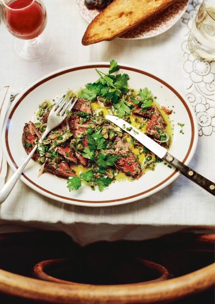 Just like with a tableside tartare, when seasoning the salsa- verde-ish sauce, you should adjust it as you see fit based on your preferences and what you have in your pantry, adding hot sauce or horseradish if you want, more or less vinegar, and so on. Also, much like tableside tartare, you should eat this with a crunchy baguette or tiny toasts over a long, late lunch or gloriously early dinner with a glass of something fabulous.