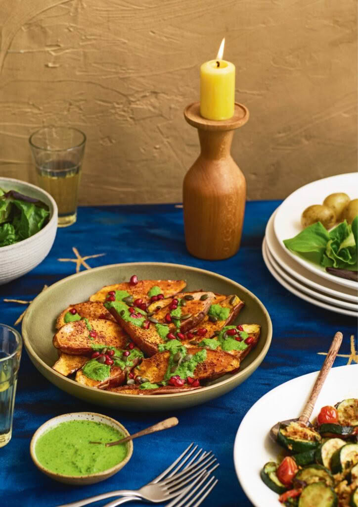 | 5. | To serve, put the kūmara on a platter, drizzle over some of the sauce and scatter with the pomegranate arils and pumpkin seeds. Put the extra sauce in a small bowl to serve alongside. |