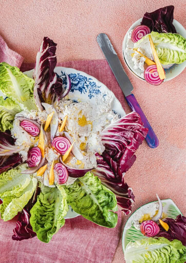 | 3. | Arrange your Little Gem and radicchio leaves on a serving plate. |