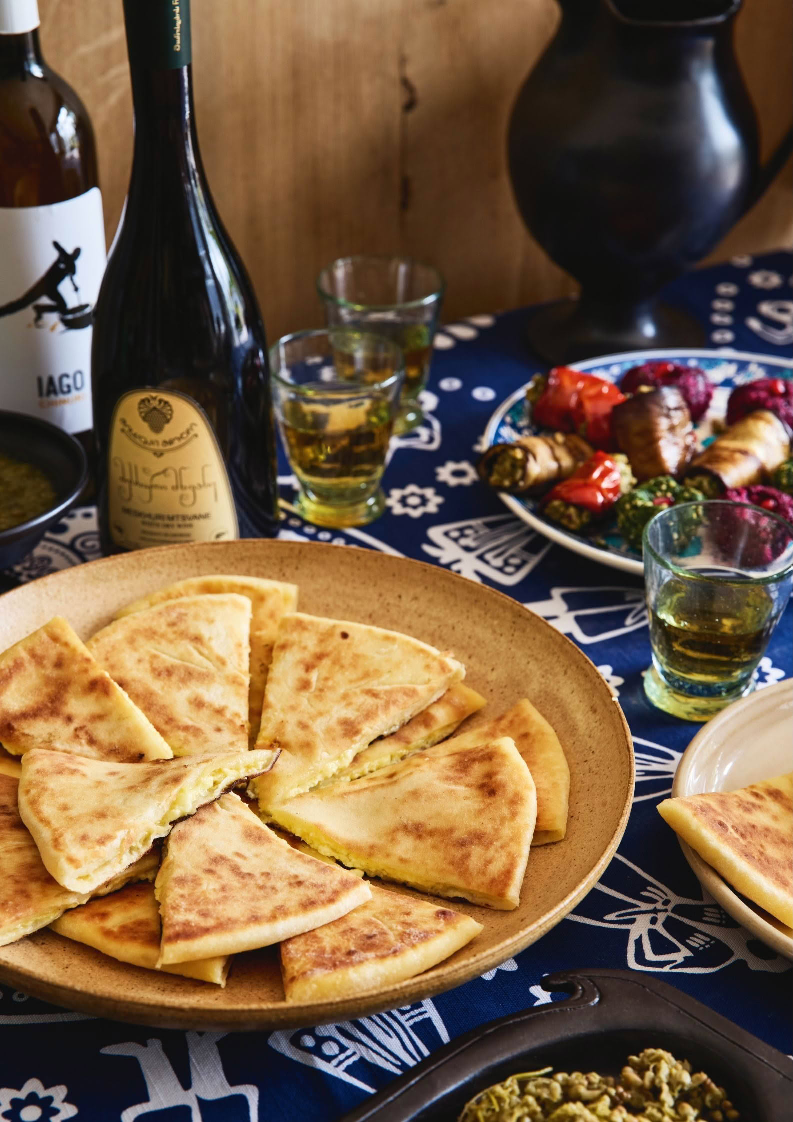 Supra is not only the name for a tablecloth (like the traditional one featured here) but also a communal feast, the epitome of Georgian hospitality. The sense of generosity is everywhere and the pace of the meal is languid. The supra is a meal without structured courses. It starts with a variety of salads or vegetable dishes, pickles, then later on meats, khinkhal (dumplings), plain and stuffed breads and accompanying sauces. We quickly learnt that moderation is key as just when you think you can’t eat or drink anything else, something more appears at the table or your wine is refilled.