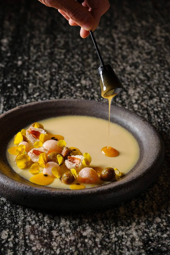 We used both the sweetness of the Mānuka Honey and aroma of the aged-whiskey to weave into the custard. The custard is steamed baked to form a very soft velvet like texture and allowed to cool before refrigerating. To serve, we paired honey-infused custard with seasonal lychee and passionfruit, giving the fragrancy of the lychee and the sharp acidity of the passionfruit. We added a teaspoon of the honey on top, to ensure the true essence of the beautiful product would meet the palate directly.