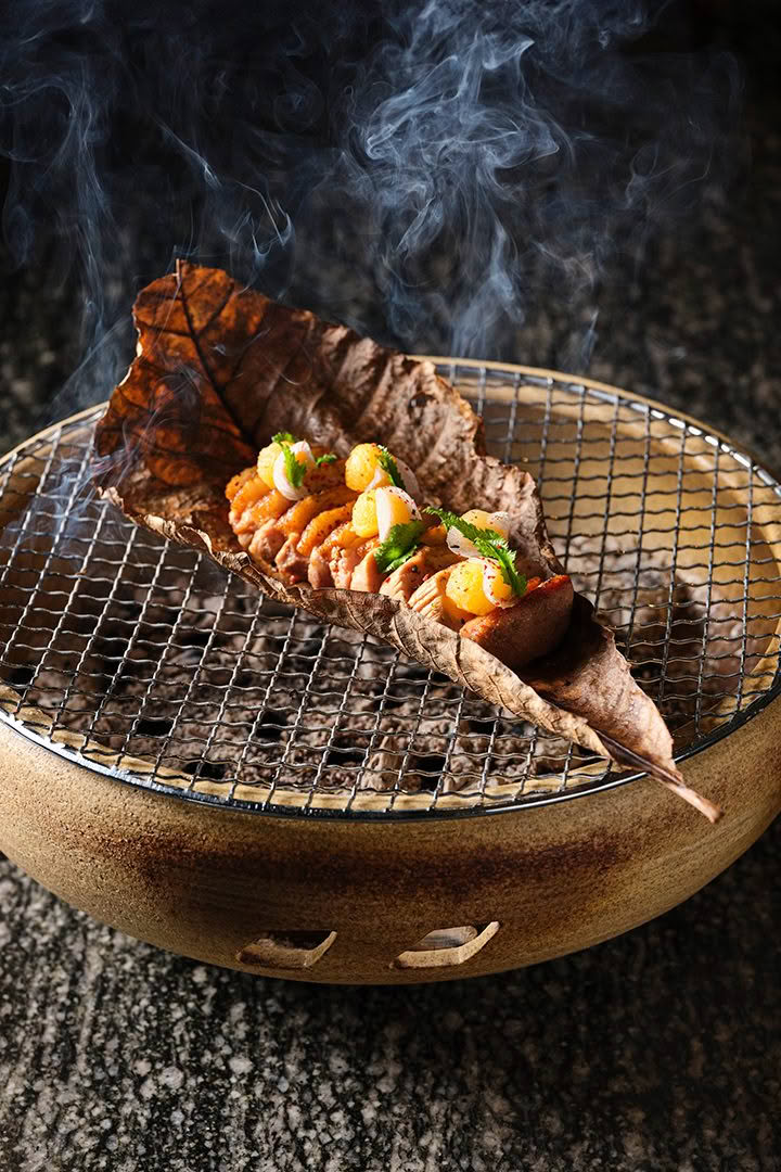 We glazed the caramelised skin and used the richness of the honey to complement the smoky rich flavours of the robata grilled duck.