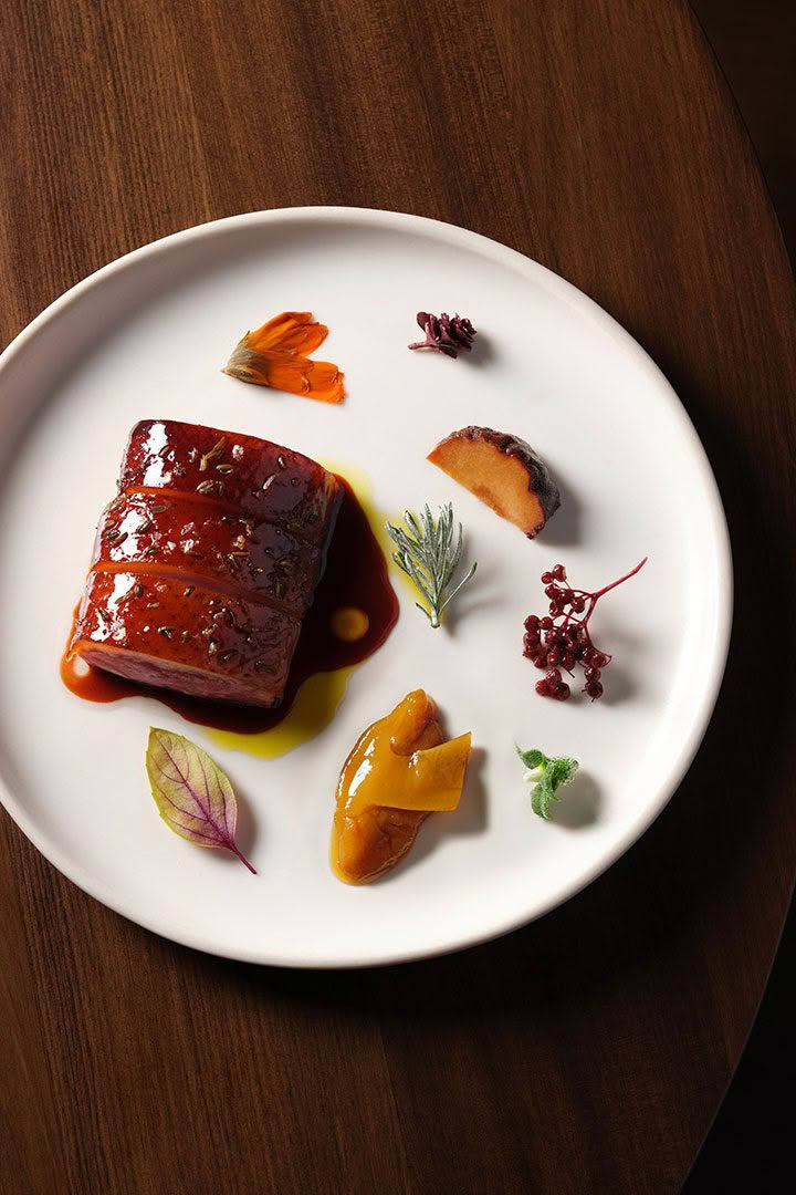 The duck is marinated in Shiokoji and whisky-infused Mānuka Honey for 20 minutes and then blanched and aged for one week.