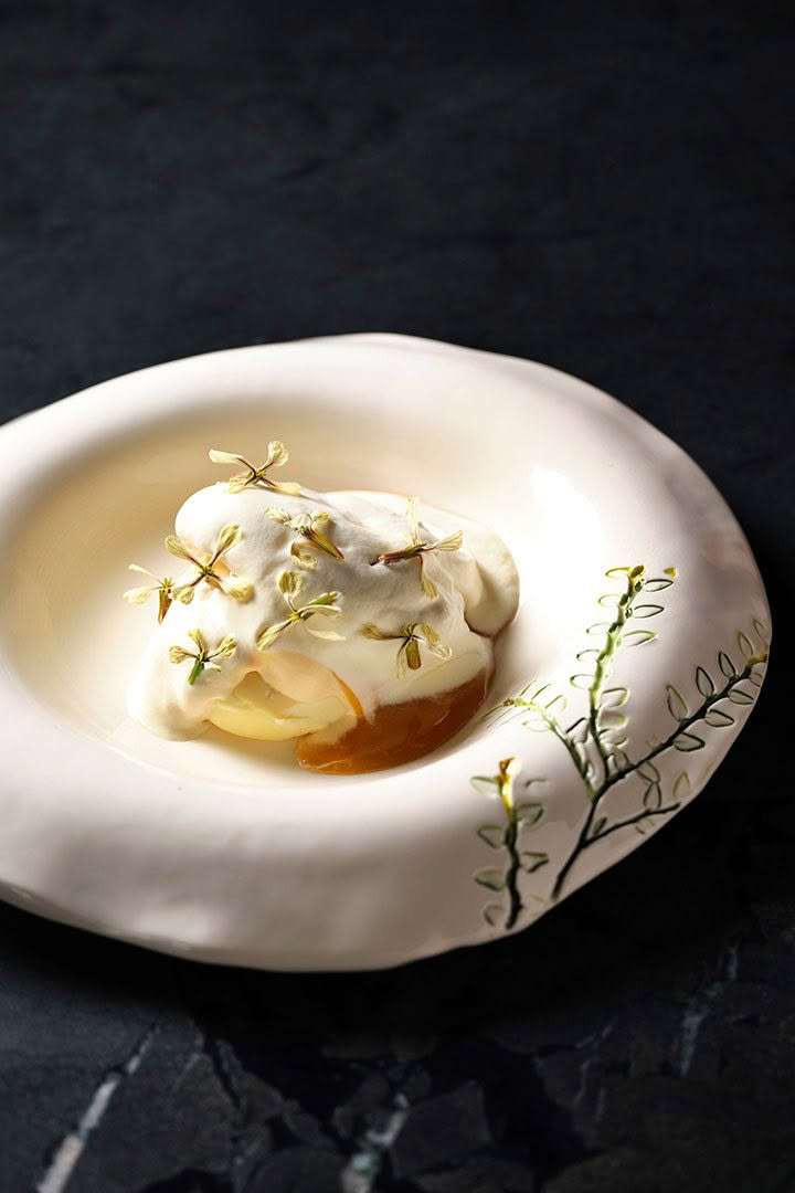We top with harvested fresh fennel and coriander seeds from our garden and season with a sauce made from roasted duck wing garum, pine syrup, bone marrow, yeast oil and cherry juice.
