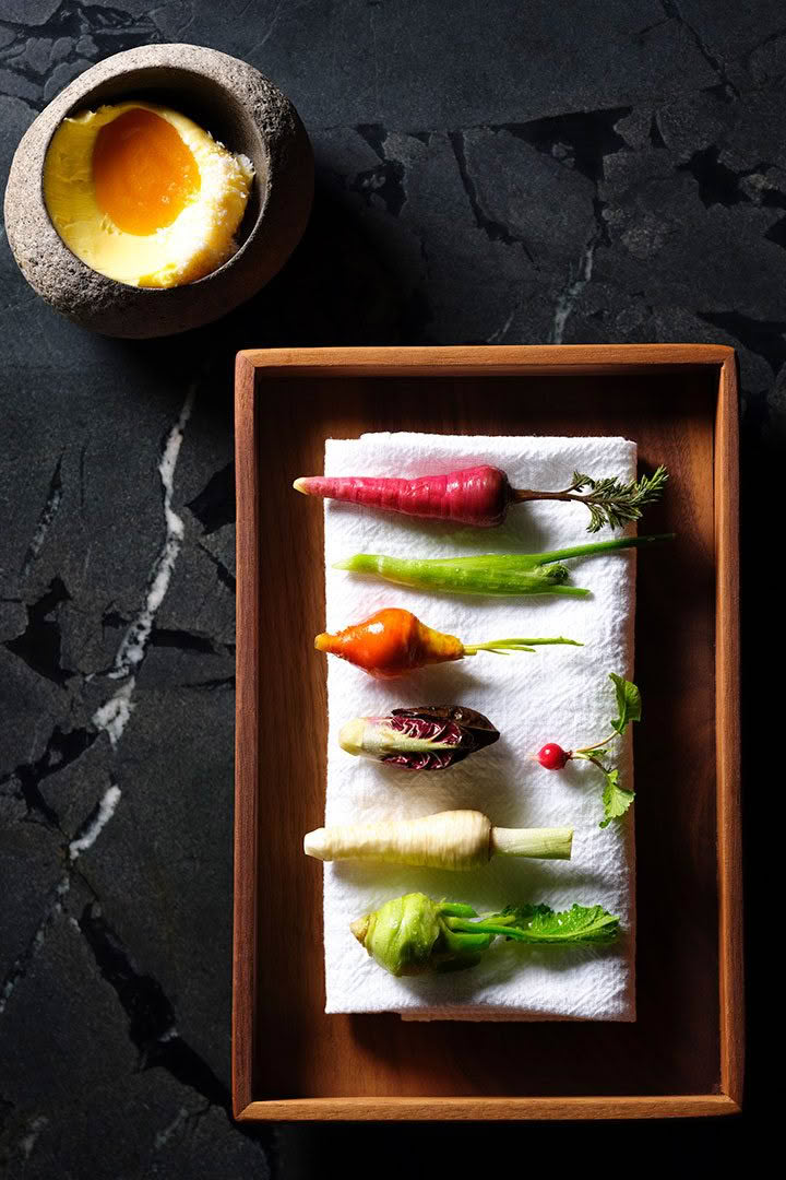 Flockhill grows most of their produce on site and their stunning creations are a representation of the season. Garden vegetables are freshly picked and served raw or lightly blanched. Heirloom carrots, fennel, beetroot, radicchio, parsnip, kohlrabi and radish. The whisky-infused Mānuka Honey was paired with cultured butter.