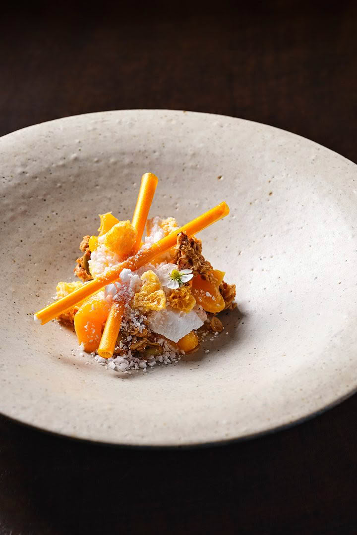 The array of ingredients complement each other in texture and taste and include tangerine curd, mandarin marmalade and segments, whisky-infused Mānuka Honey, hokey pokey, mandarin coconut sherbet, pavlova, coconut yoghurt, fermented pepper and carrot wafers, hard’ granola, white strawberry flowers, frozen coconut milk granita and tangerine sorbet.