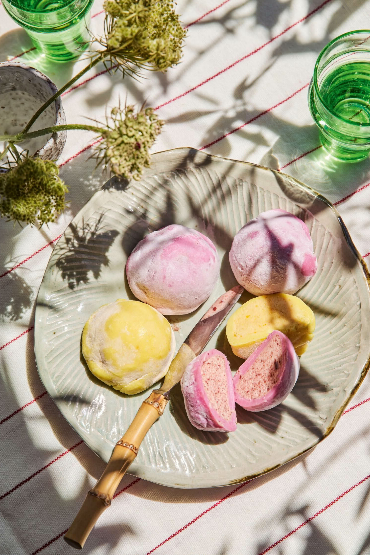 Coarsely dice 2 persimmons and press through an electric juicer. Measure persimmon juice, then juice ripe mandarins (skin and all) until you have 250ml juice in total (the mandarin count will vary with each batch if you get ones that are a tad dry). Place into a medium pot and add 6g agar powder (I use Lotus Brand) and 2 tablespoons caster sugar. Bring to the boil for 90 seconds then remove from heat. Pour liquid into a clean ice cube tray to cool for 60 minutes. Remove from the tray and place on an airing rack overnight to dehydrate to a gummy texture.